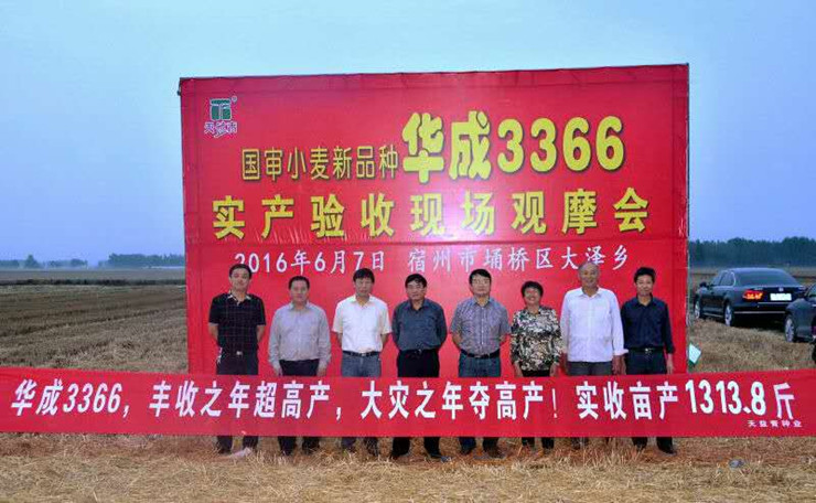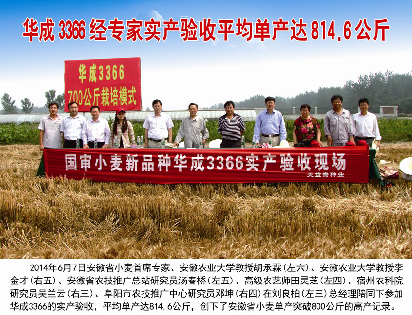 2、2014年:2014年6月7日安徽省小麥?zhǔn)紫瘜<摇不辙r(nóng)業(yè)大學(xué)教授胡承霖等專家參加了華成3366的實(shí)產(chǎn)驗(yàn)收,平均畝產(chǎn)達(dá)1629.2斤,創(chuàng)下了安徽省小麥單產(chǎn)突破800公斤的高產(chǎn)記錄。